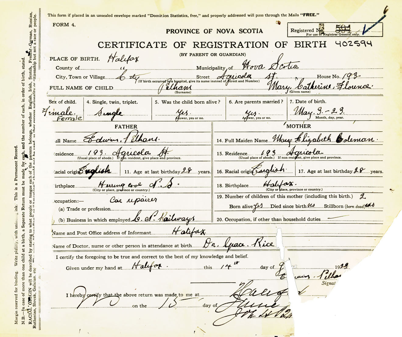 Female Birth Registration: Year: 1923 number: 40200594