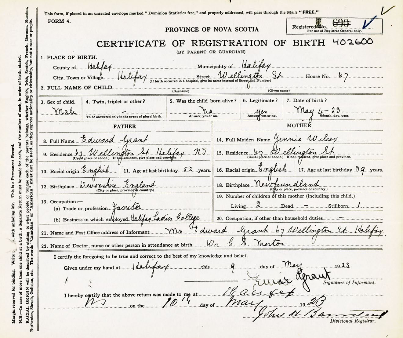 Male Birth Registration: Year: 1923 number: 40200600