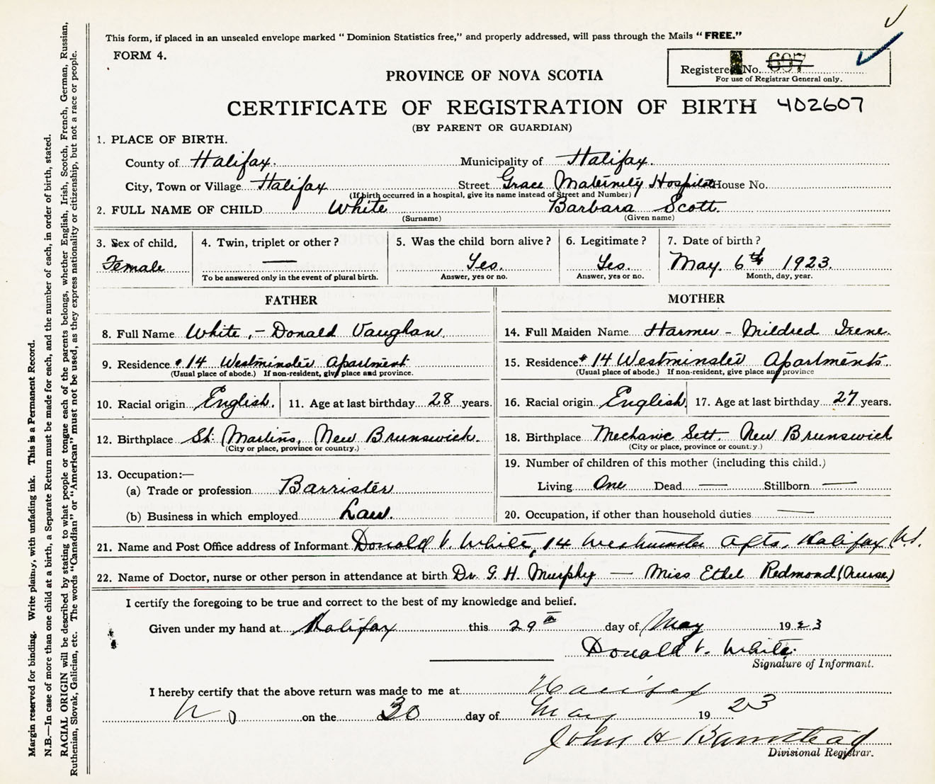 Female Birth Registration: Year: 1923 number: 40200607