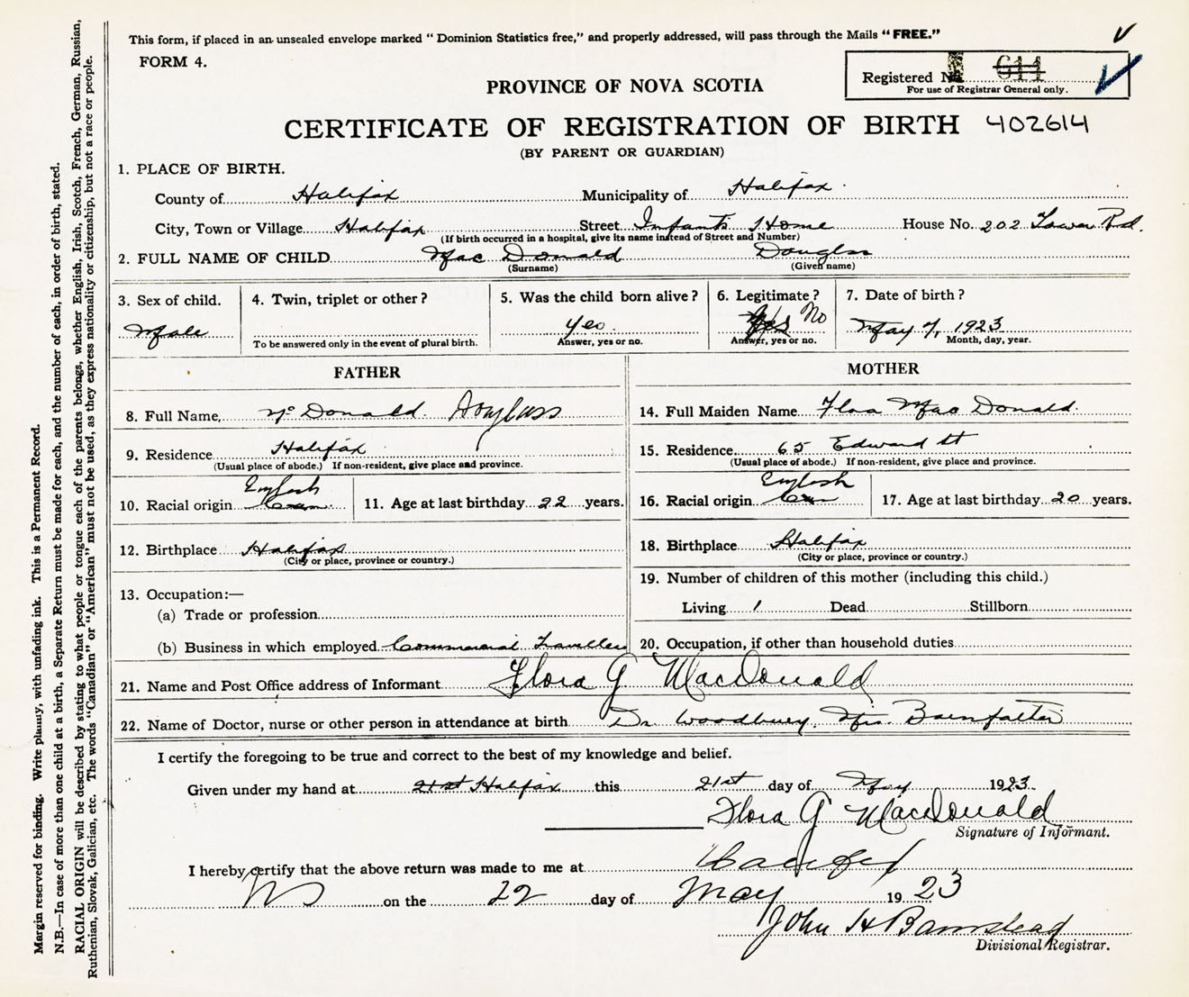 Male Birth Registration: Year: 1923 number: 40200614