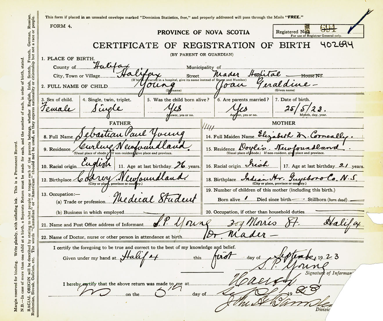 Female Birth Registration: Year: 1923 number: 40200694