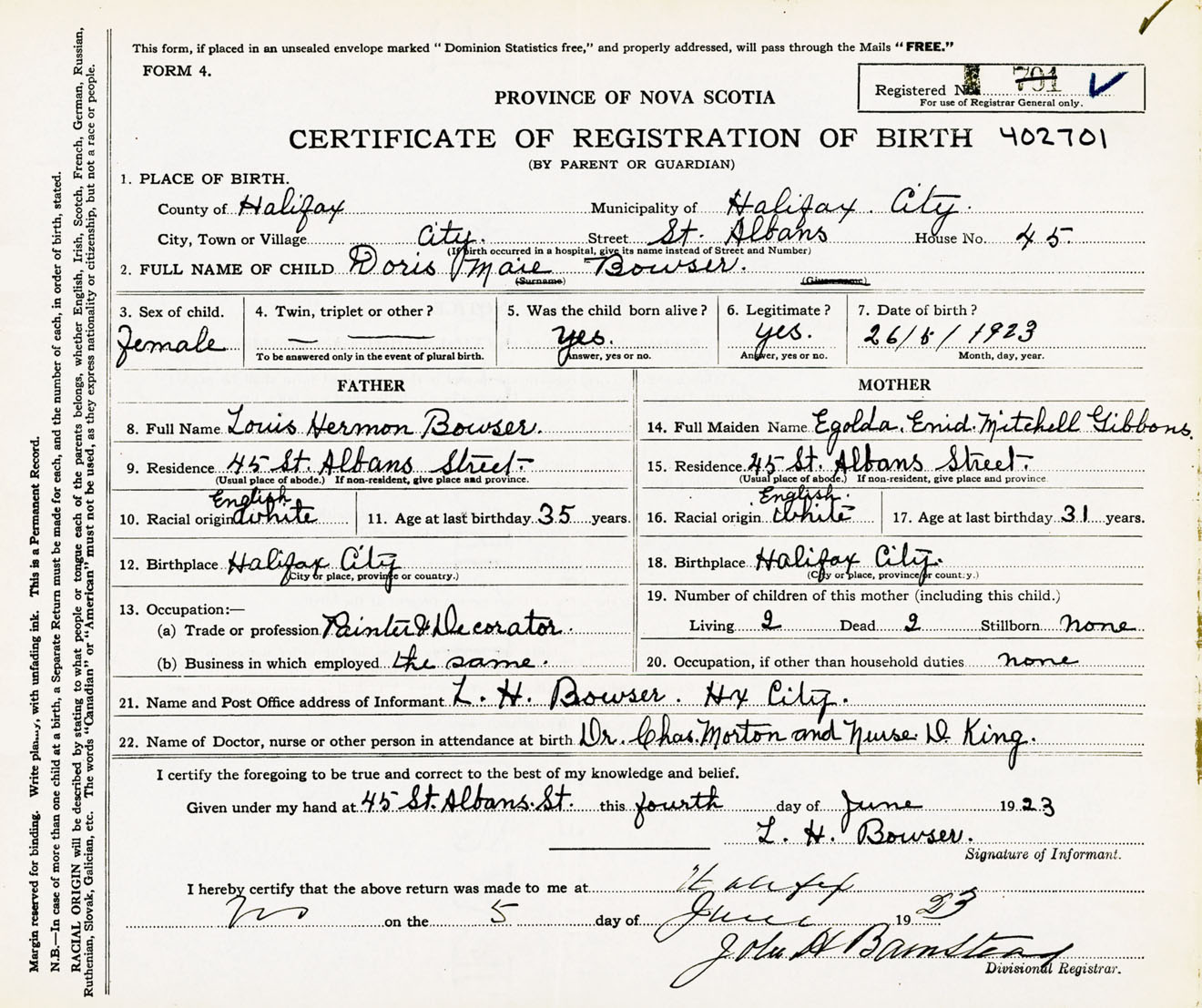 Female Birth Registration: Year: 1923 number: 40200701