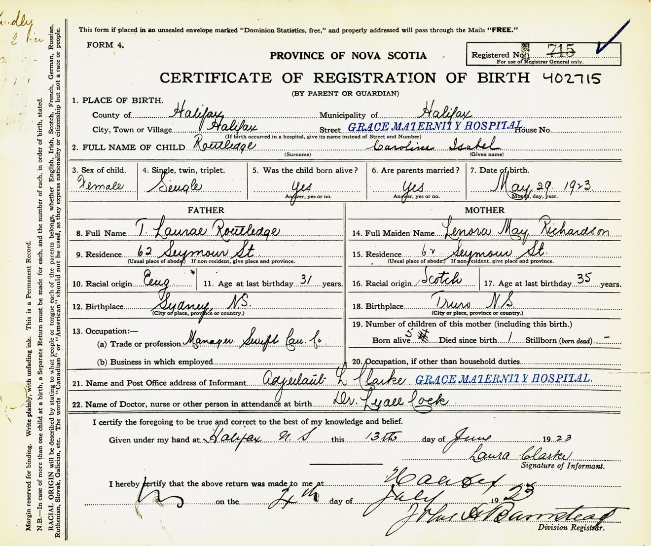 Female Birth Registration: Year: 1923 number: 40200715