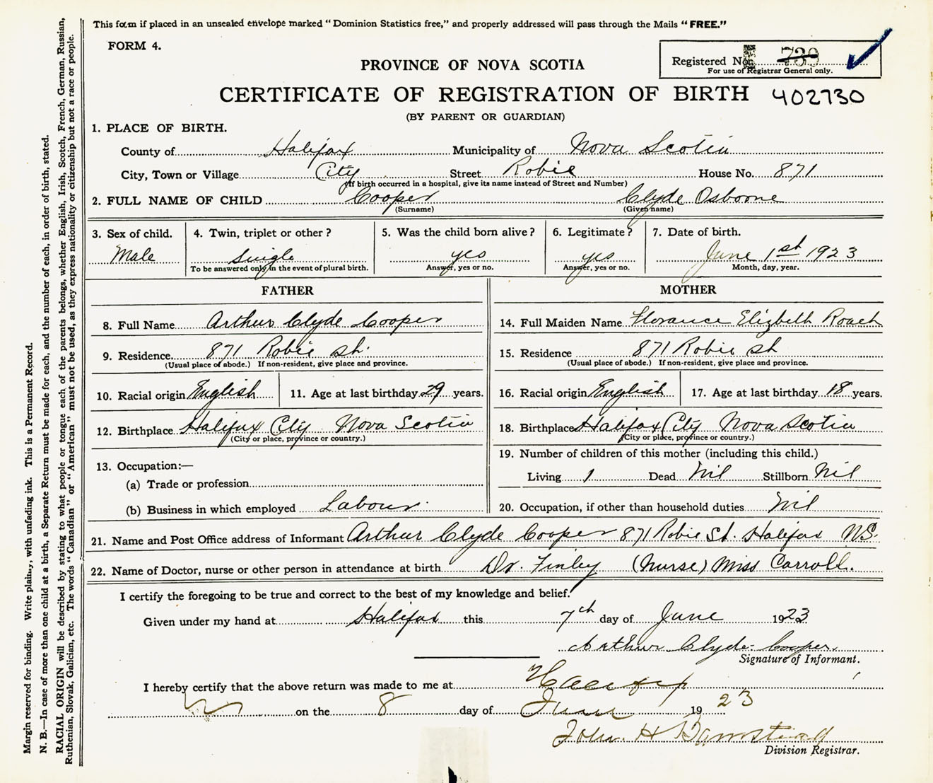 Male Birth Registration: Year: 1923 number: 40200730
