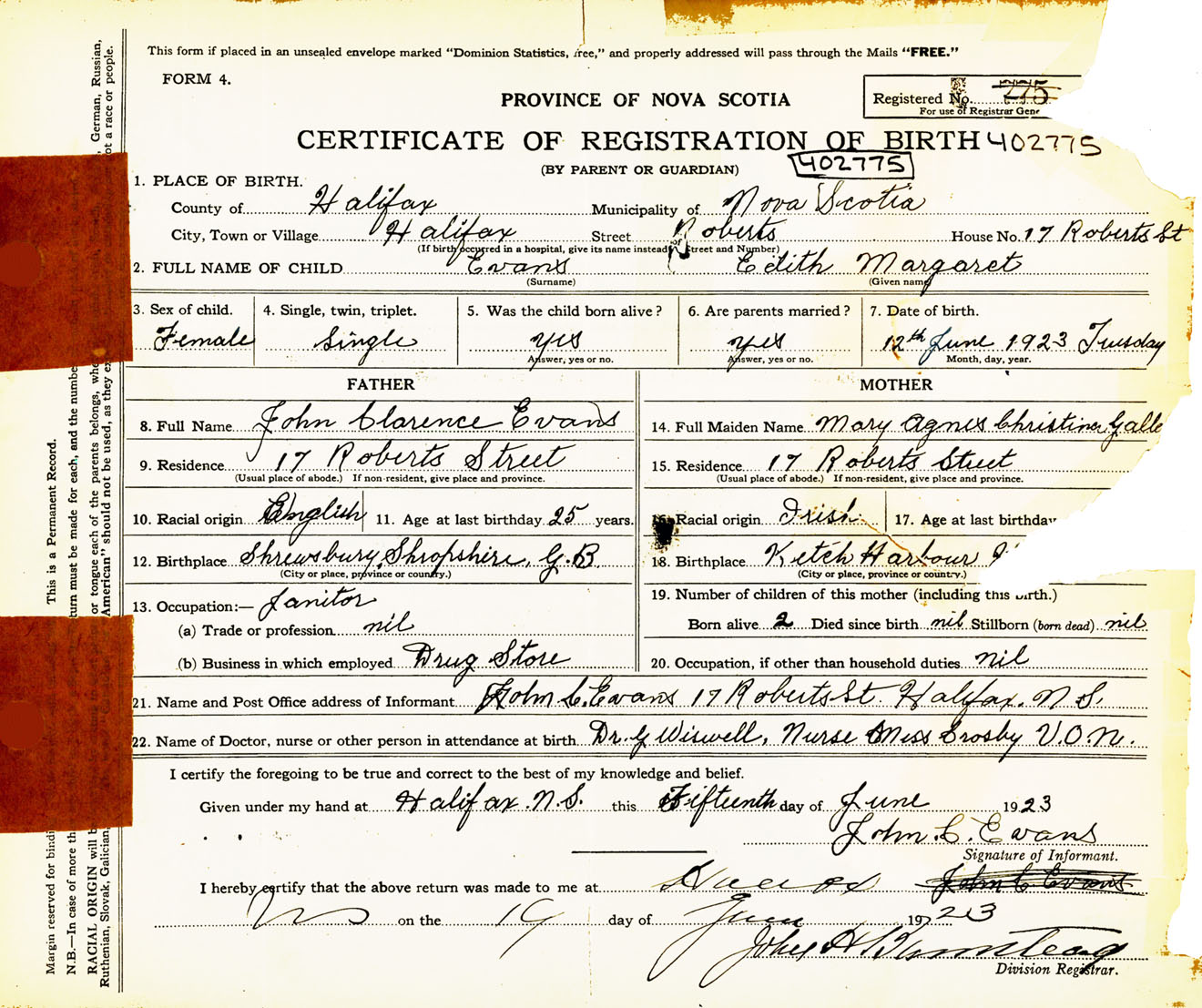 Female Birth Registration: Year: 1923 number: 40200775