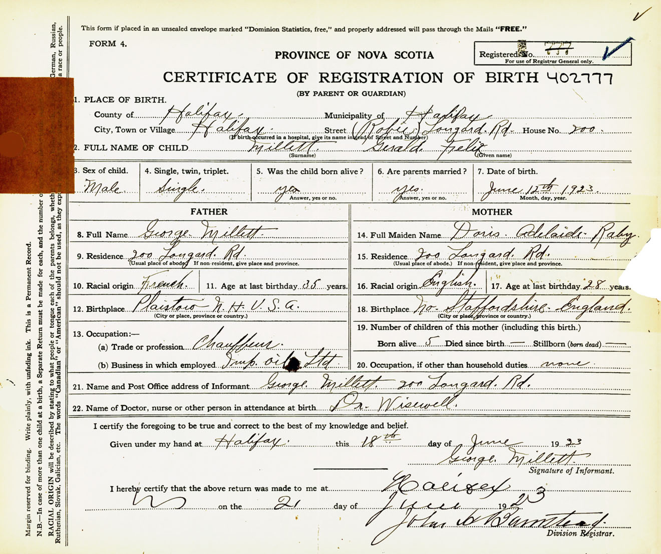 Male Birth Registration: Year: 1923 number: 40200777