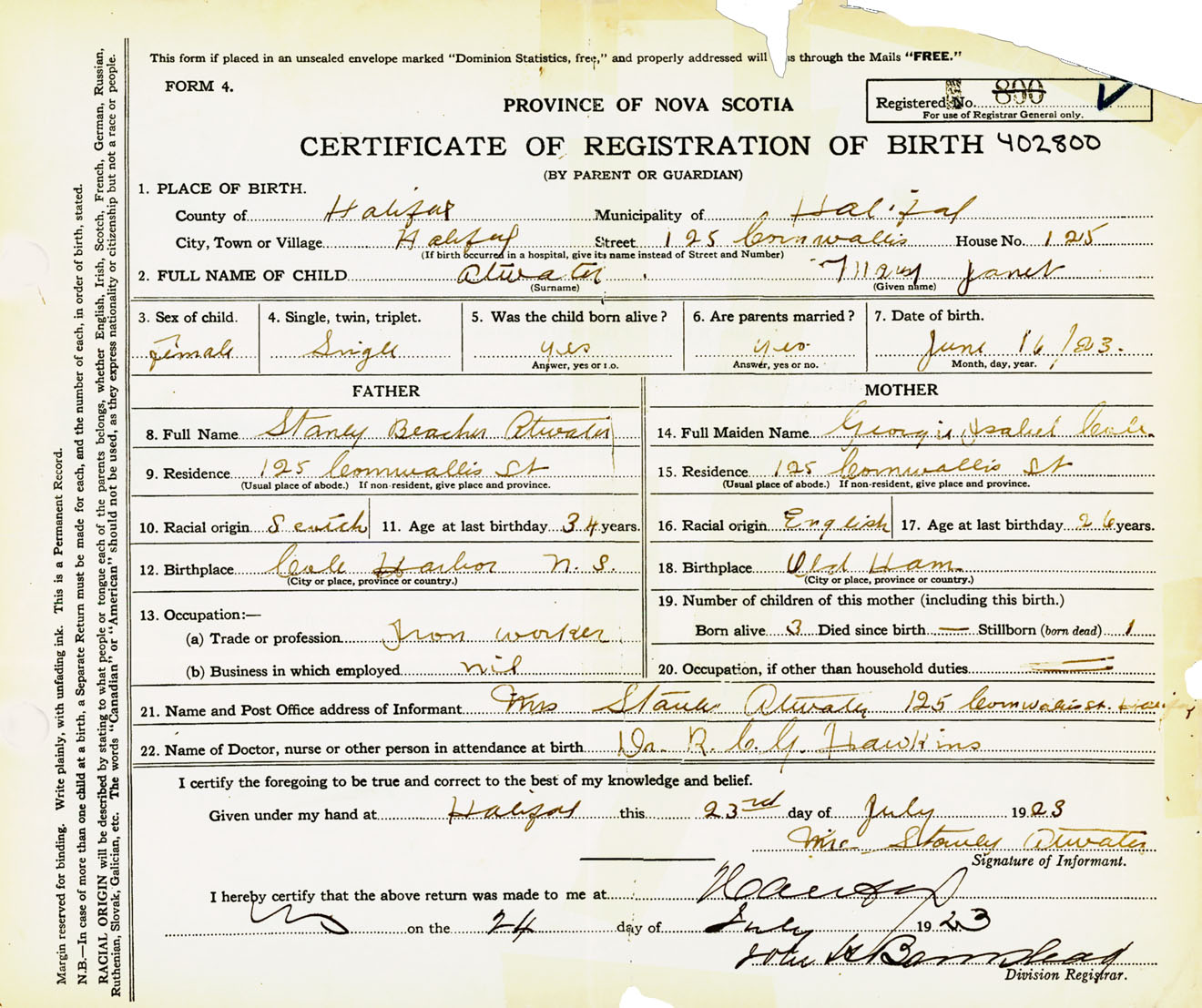 Female Birth Registration: Year: 1923 number: 40200800