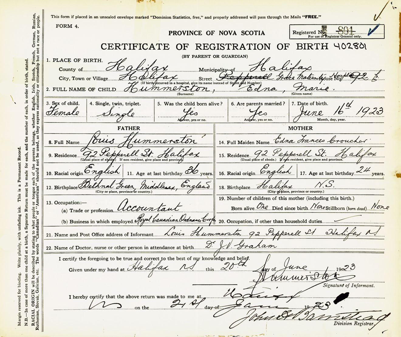 Female Birth Registration: Year: 1923 number: 40200801