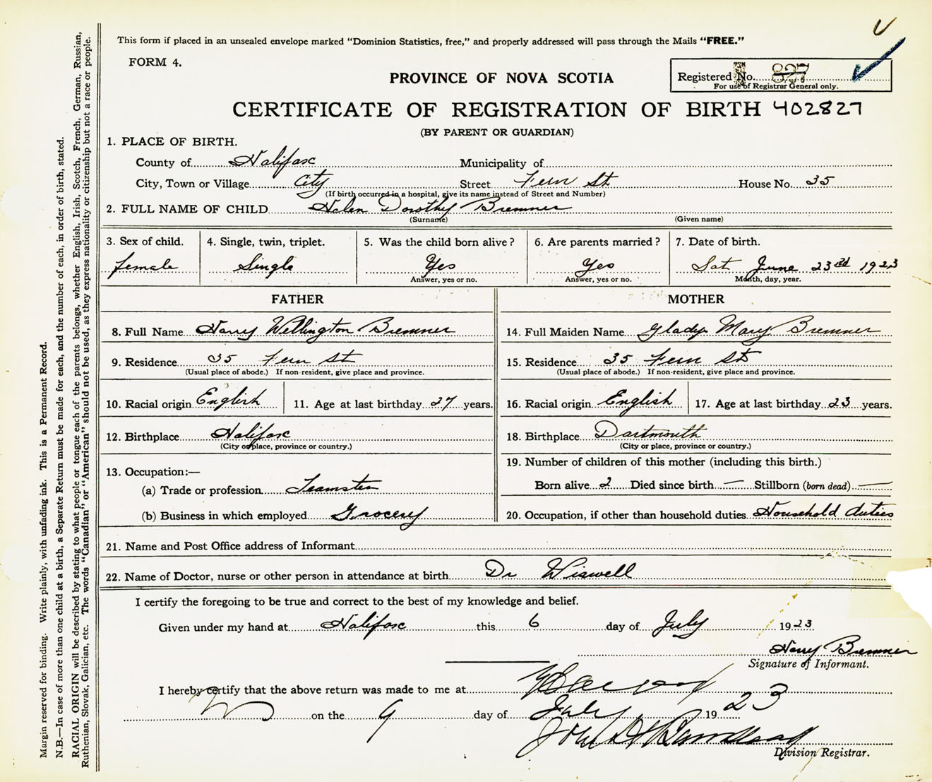 Female Birth Registration: Year: 1923 number: 40200827