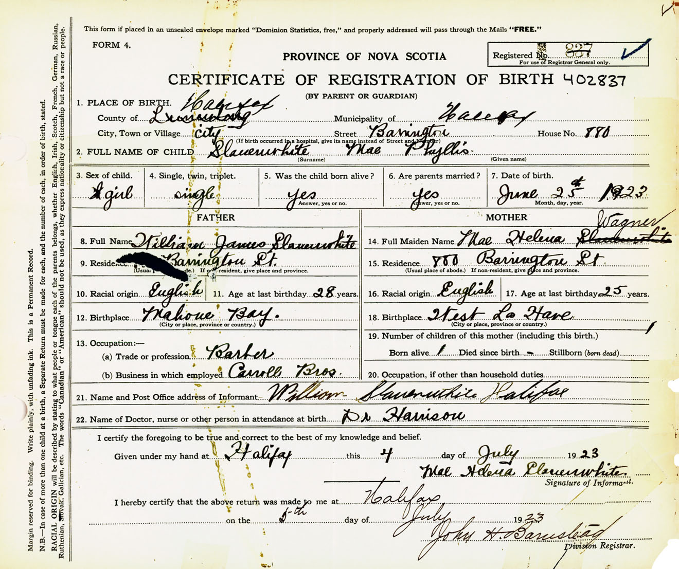 Female Birth Registration: Year: 1923 number: 40200837