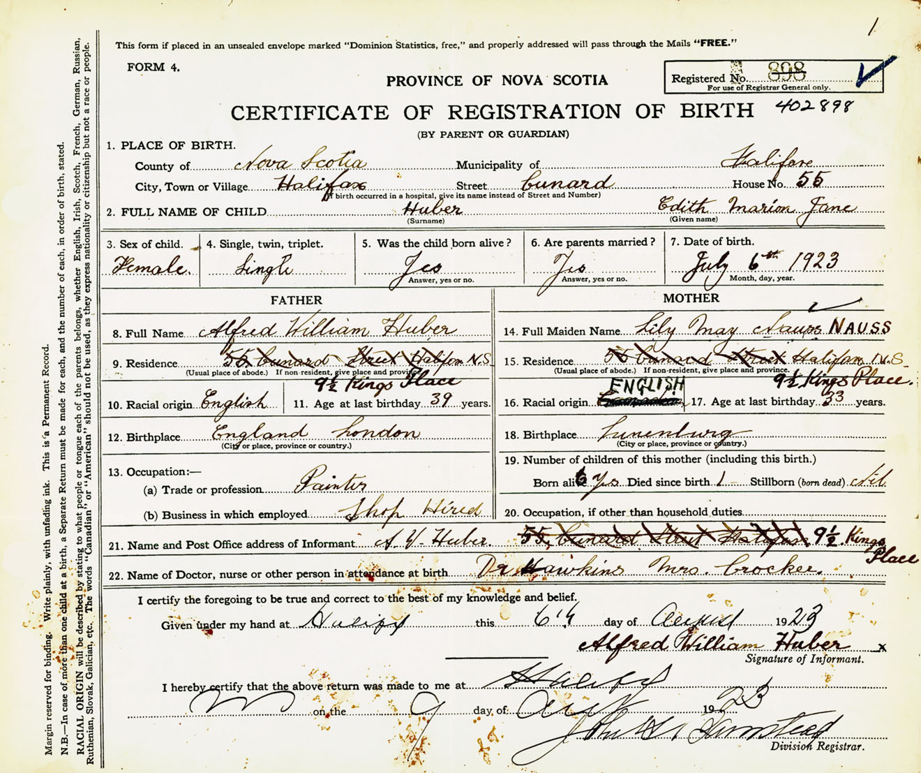 Female Birth Registration: Year: 1923 number: 40200898