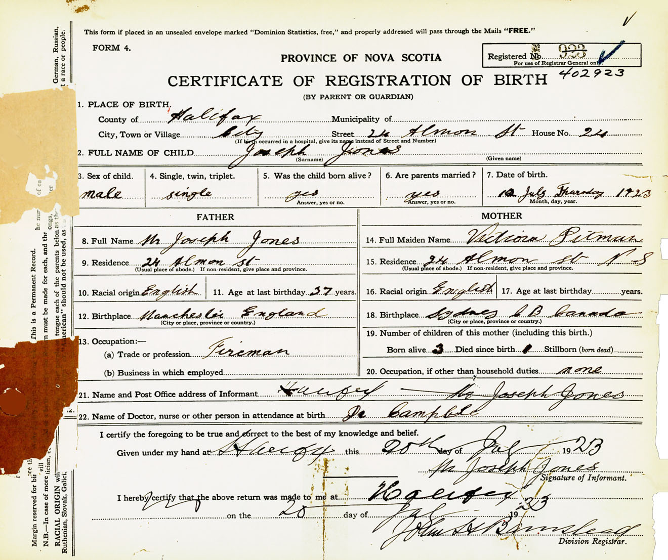 Male Birth Registration: Year: 1923 number: 40200923