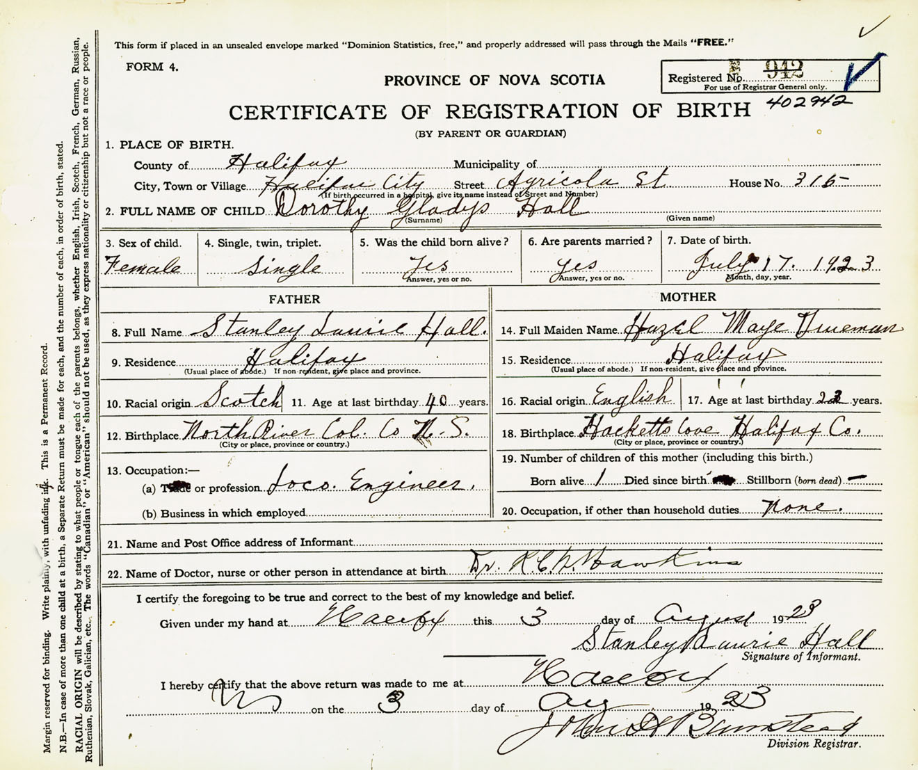 Female Birth Registration: Year: 1923 number: 40200942