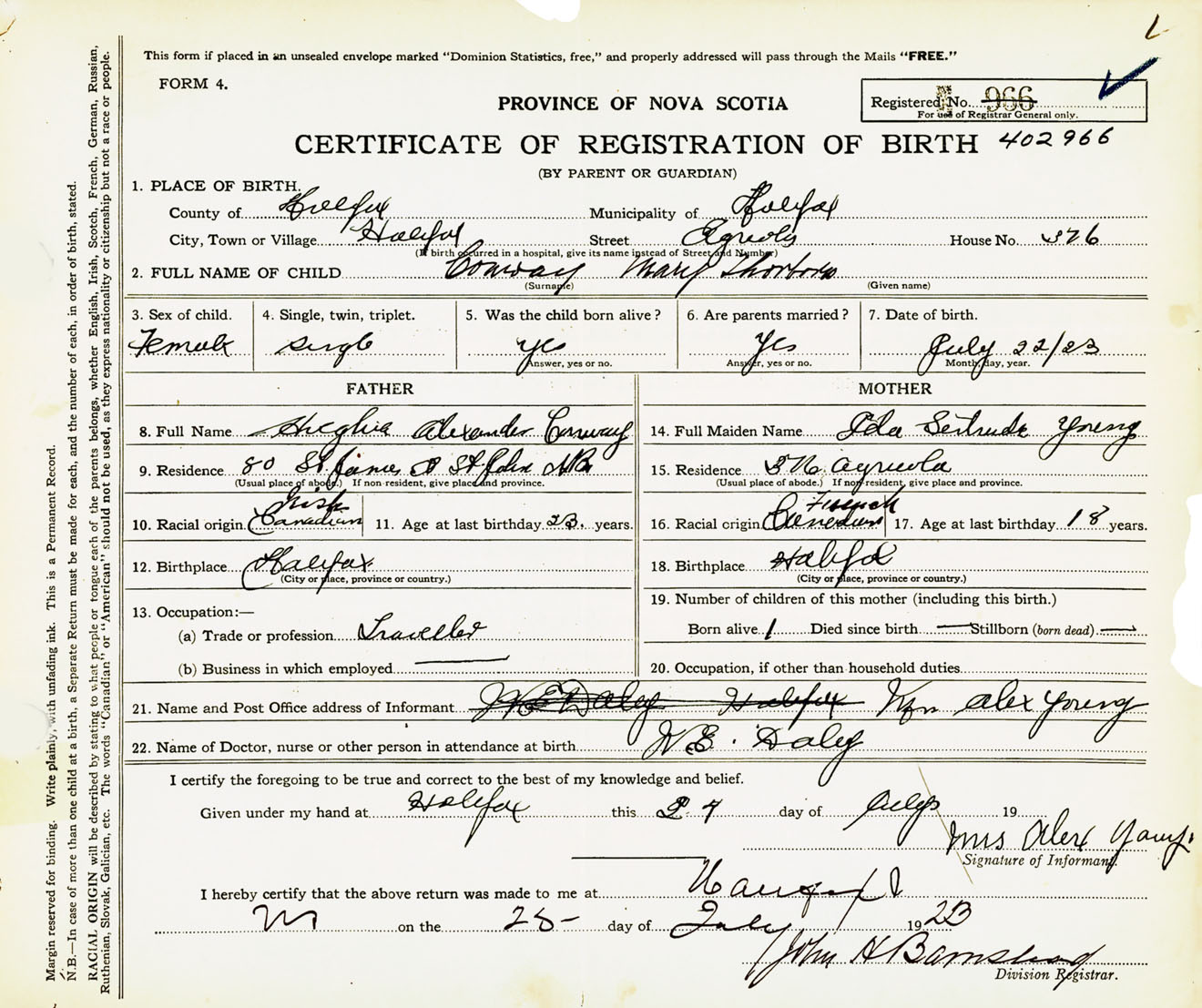 Female Birth Registration: Year: 1923 number: 40200966