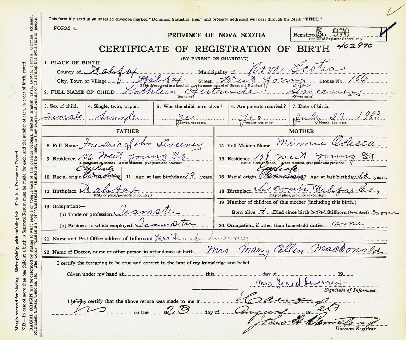 Female Birth Registration: Year: 1923 number: 40200970