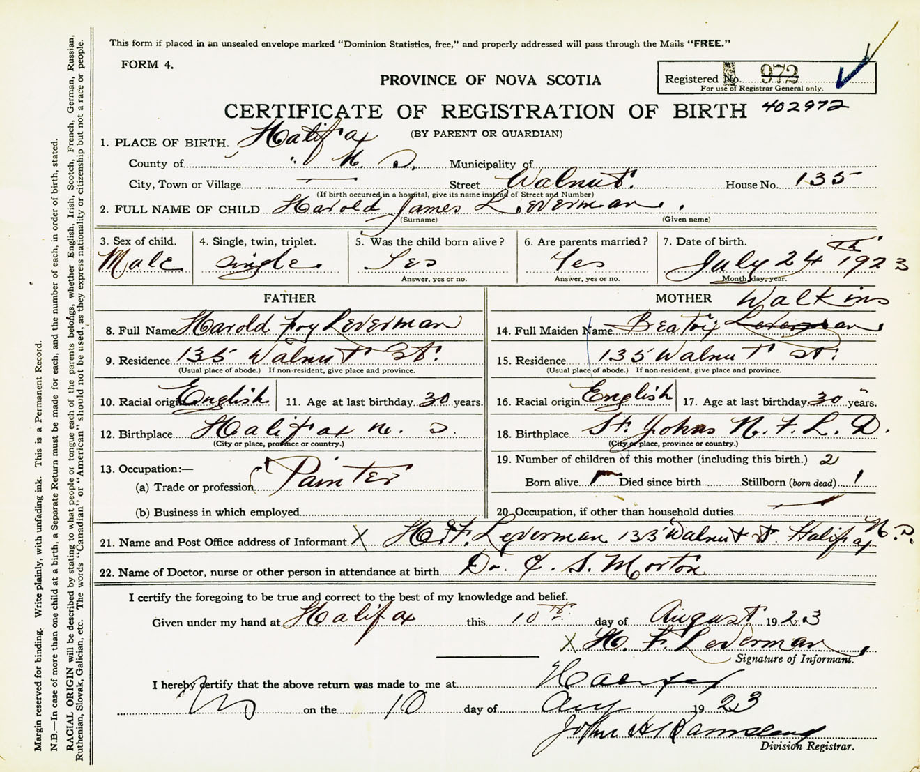 Male Birth Registration: Year: 1923 number: 40200972