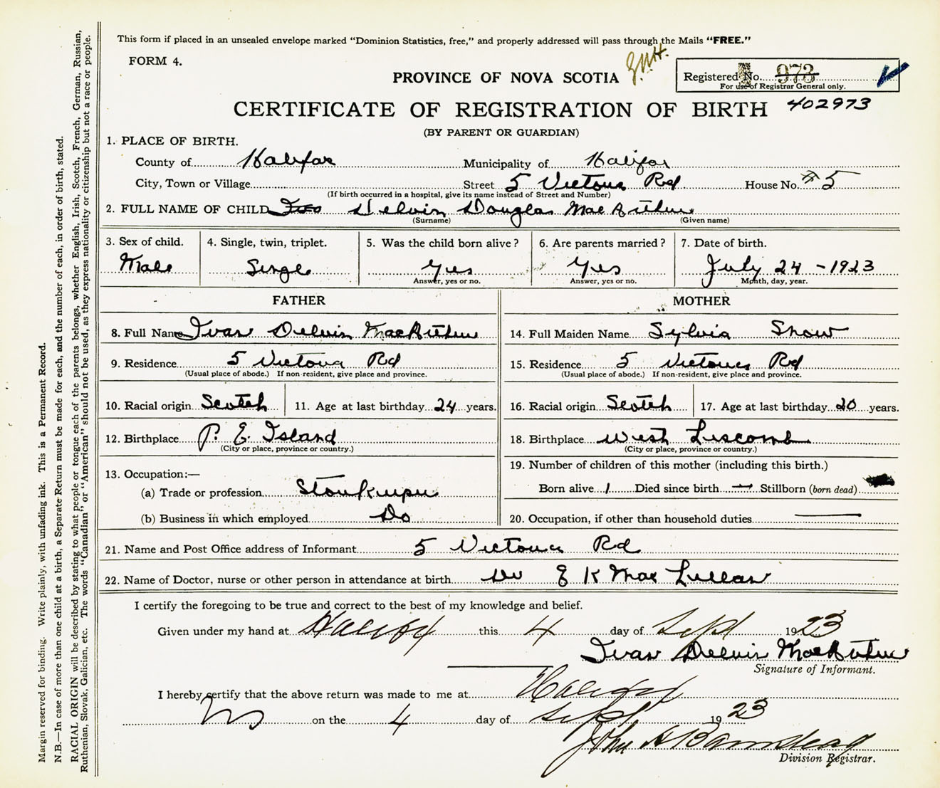 Male Birth Registration: Year: 1923 number: 40200973