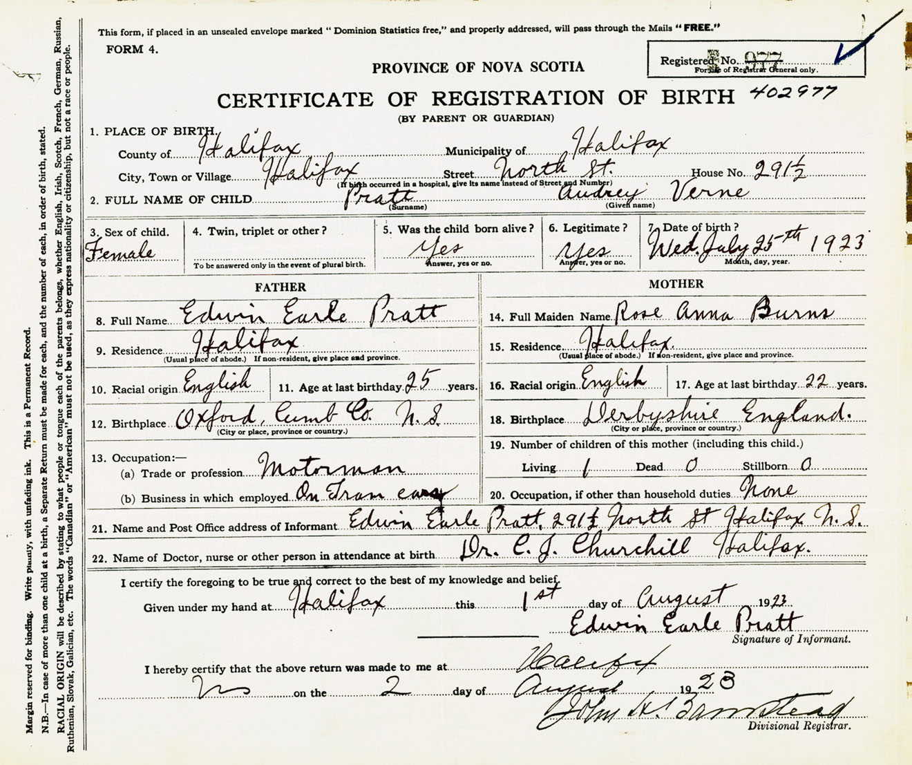 Female Birth Registration: Year: 1923 number: 40200977