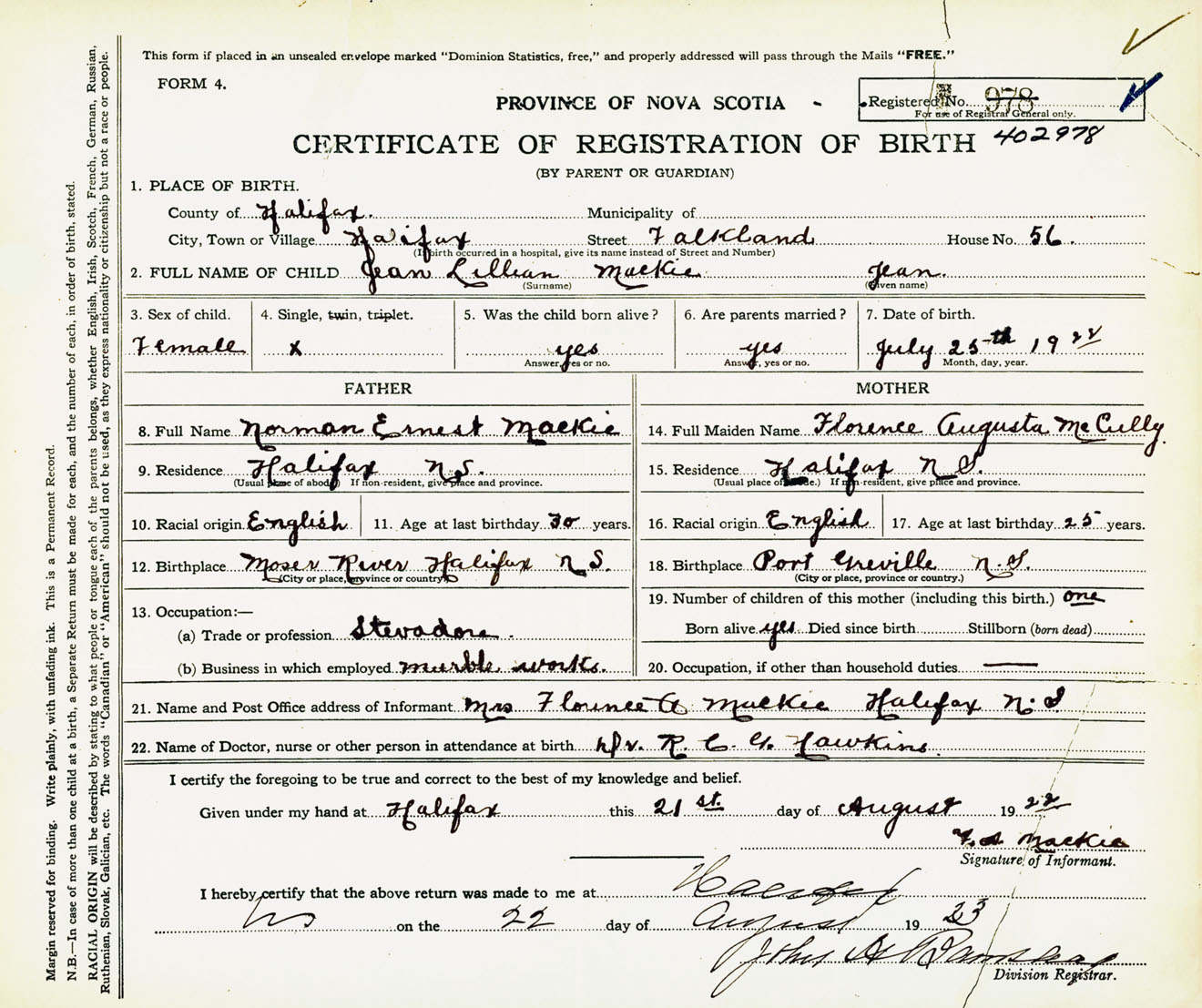 Female Birth Registration: Year: 1923 number: 40200978