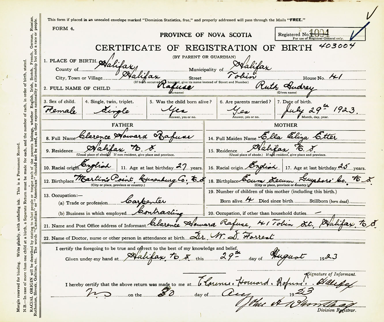 Female Birth Registration: Year: 1923 number: 40300004