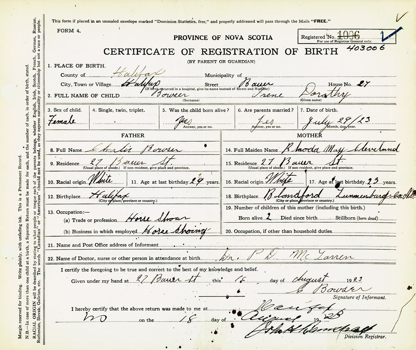 Female Birth Registration: Year: 1923 number: 40300006