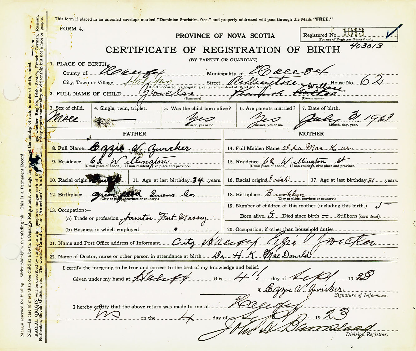 Male Birth Registration: Year: 1923 number: 40300013