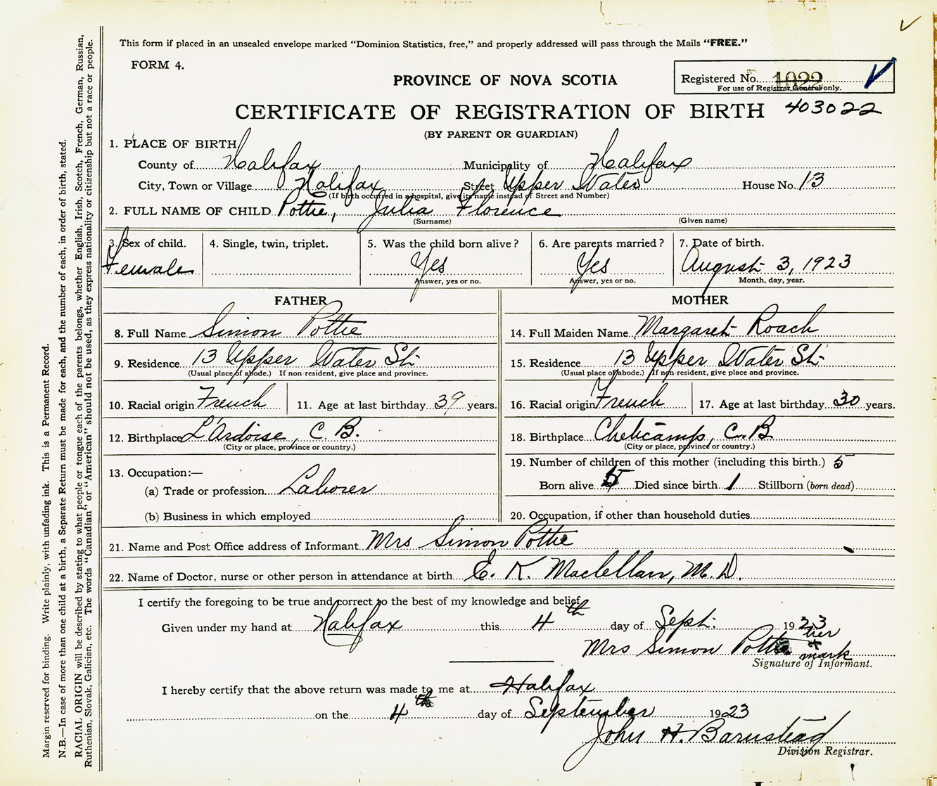 Female Birth Registration: Year: 1923 number: 40300022