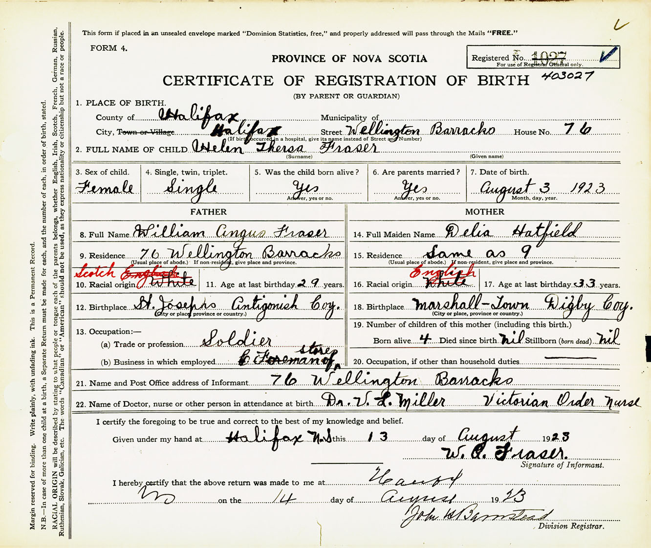 Female Birth Registration: Year: 1923 number: 40300027
