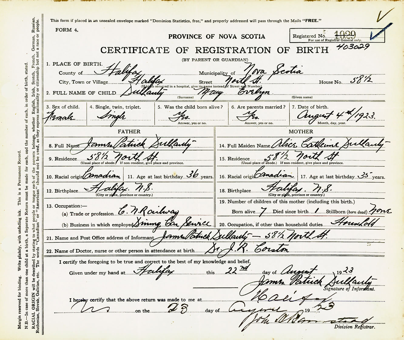 Female Birth Registration: Year: 1923 number: 40300029