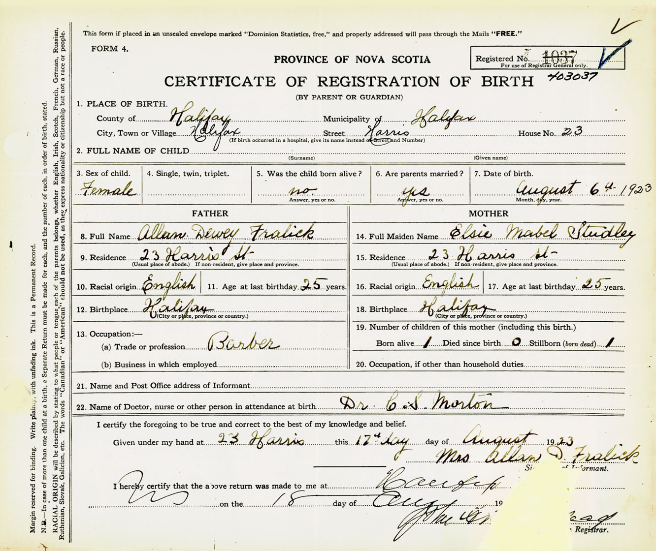 Female Birth Registration: Year: 1923 number: 40300037