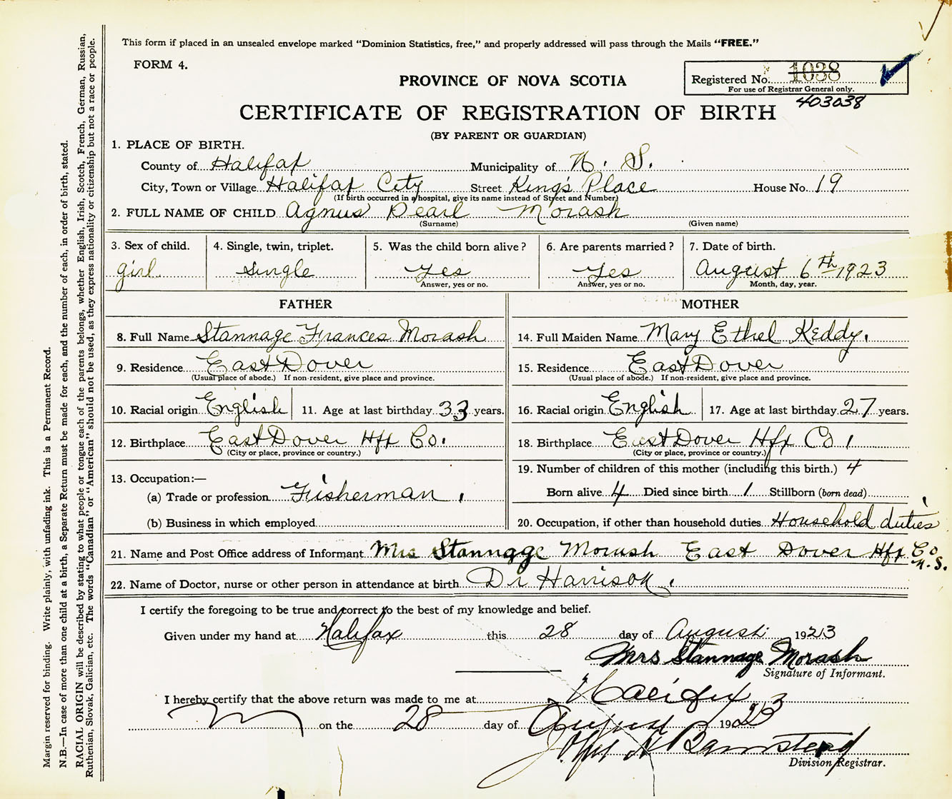 Female Birth Registration: Year: 1923 number: 40300038