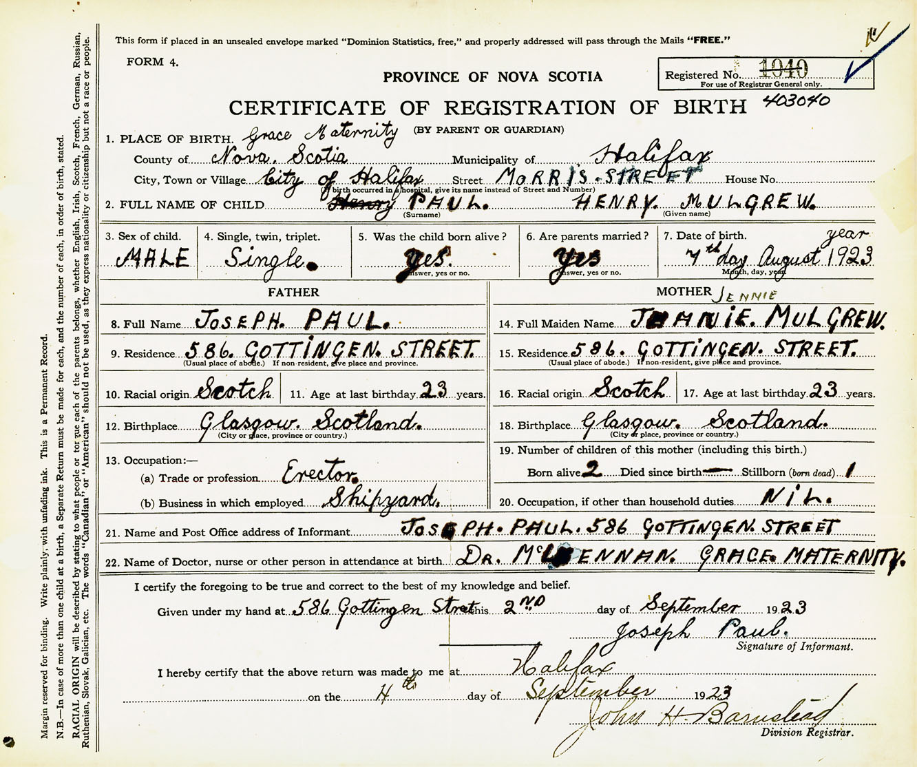 Male Birth Registration: Year: 1923 number: 40300040