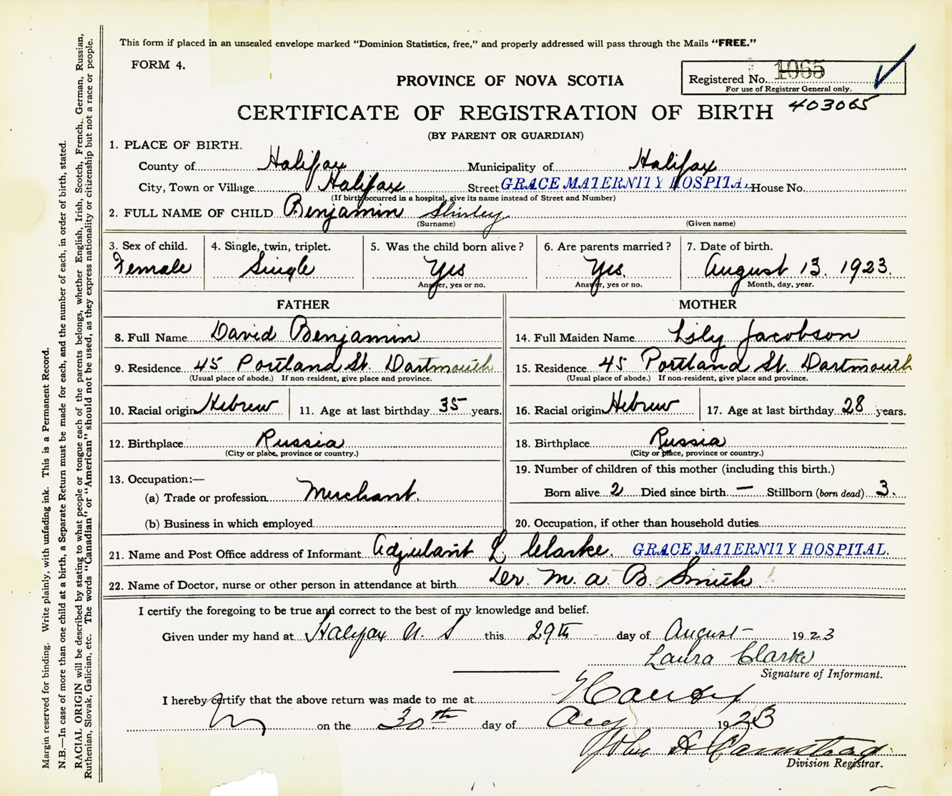 Female Birth Registration: Year: 1923 number: 40300065