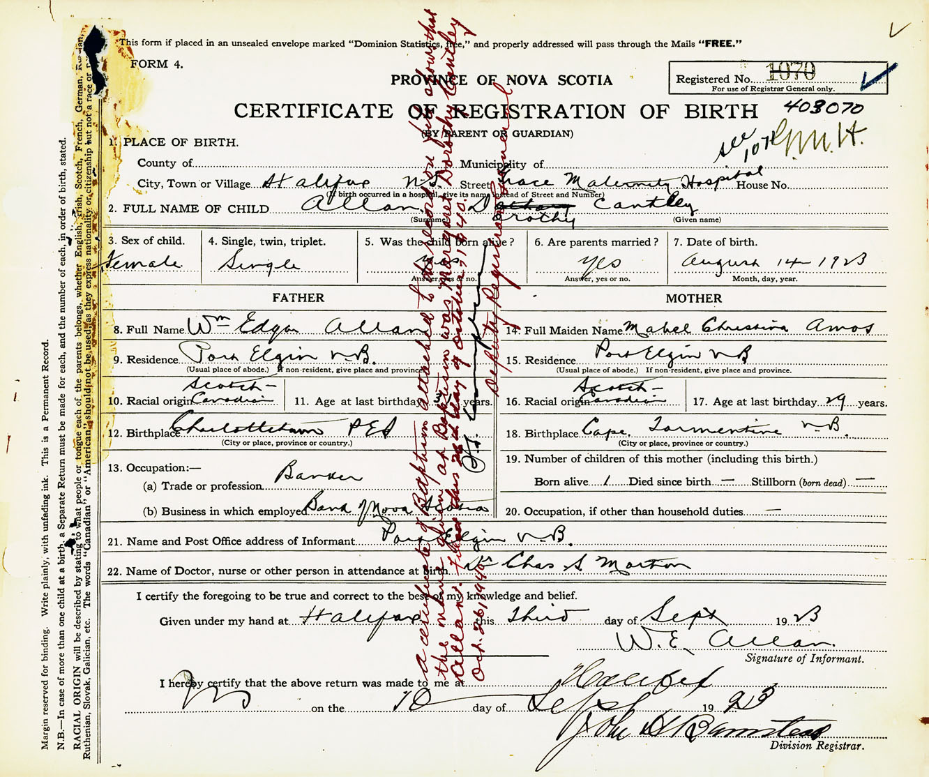 Female Birth Registration: Year: 1923 number: 40300070