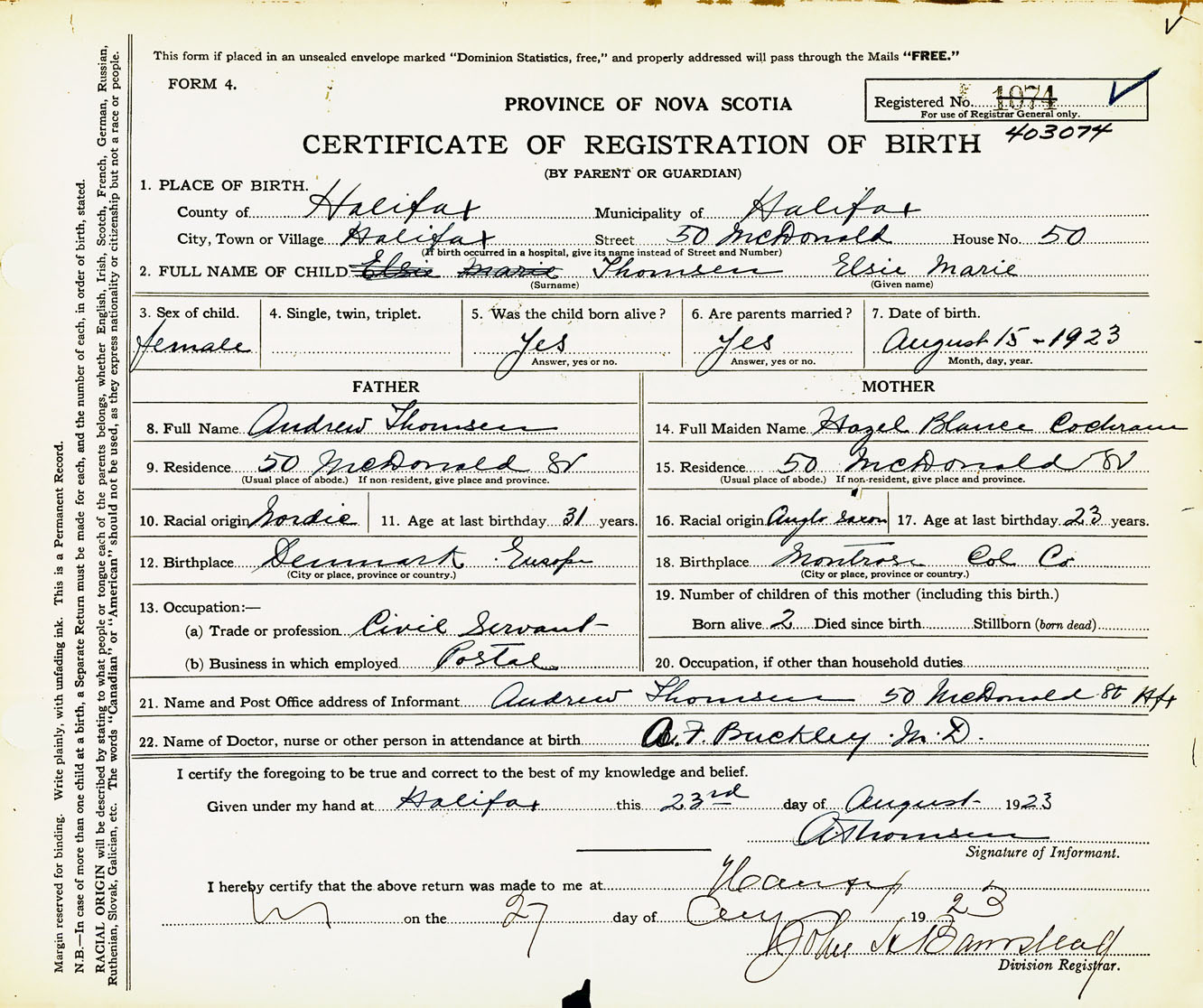 Female Birth Registration: Year: 1923 number: 40300074