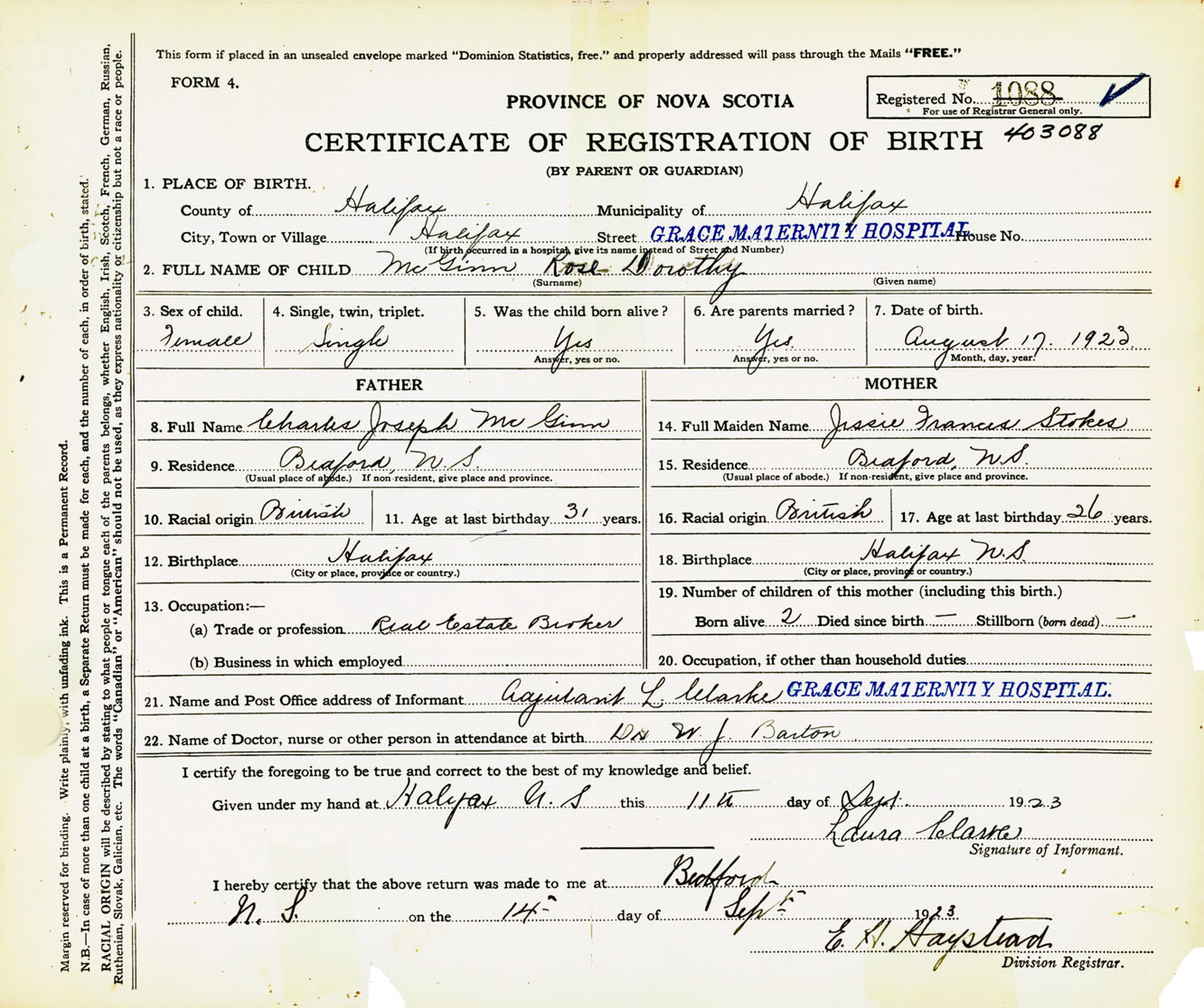 Female Birth Registration: Year: 1923 number: 40300088