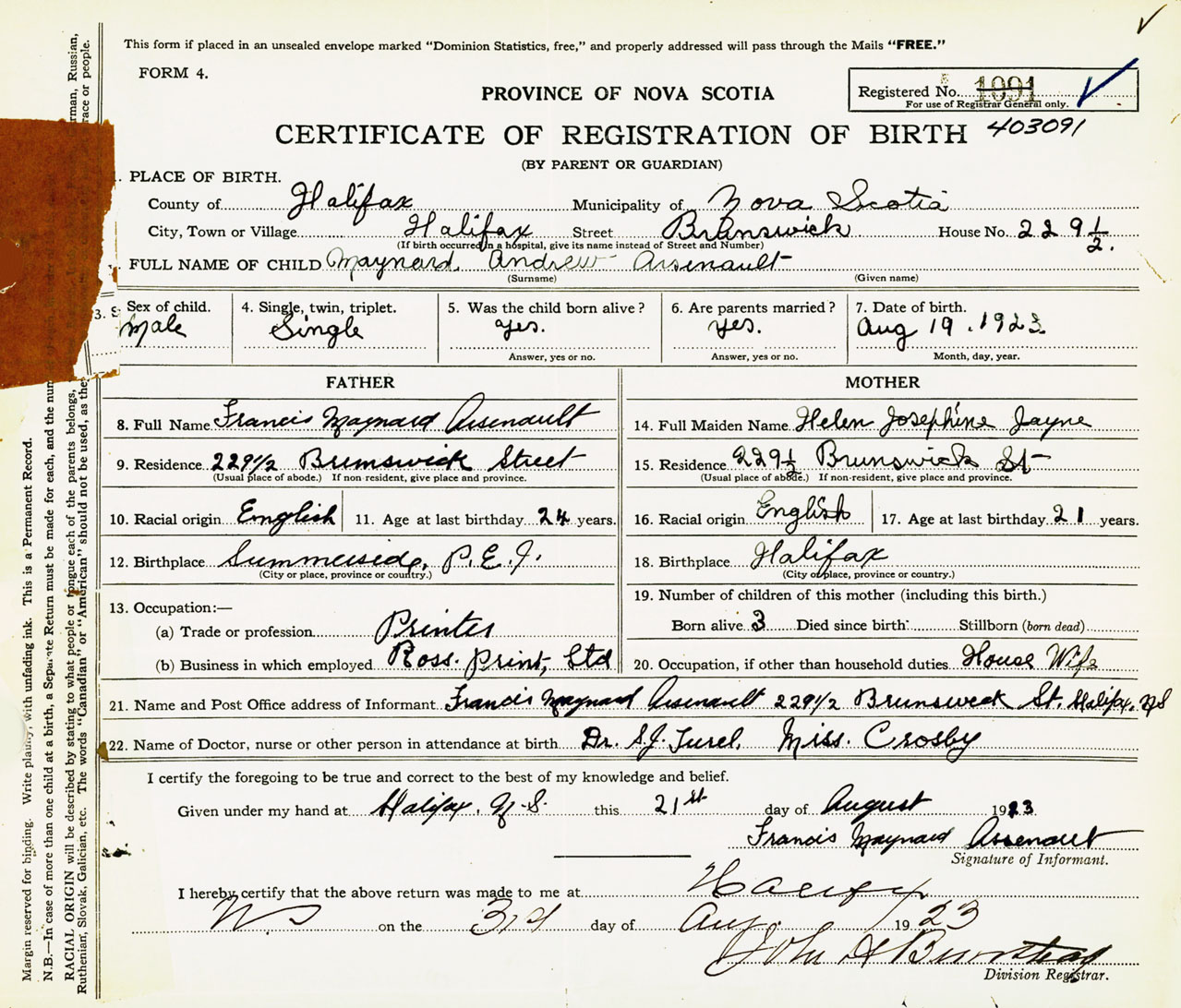 Male Birth Registration: Year: 1923 number: 40300091