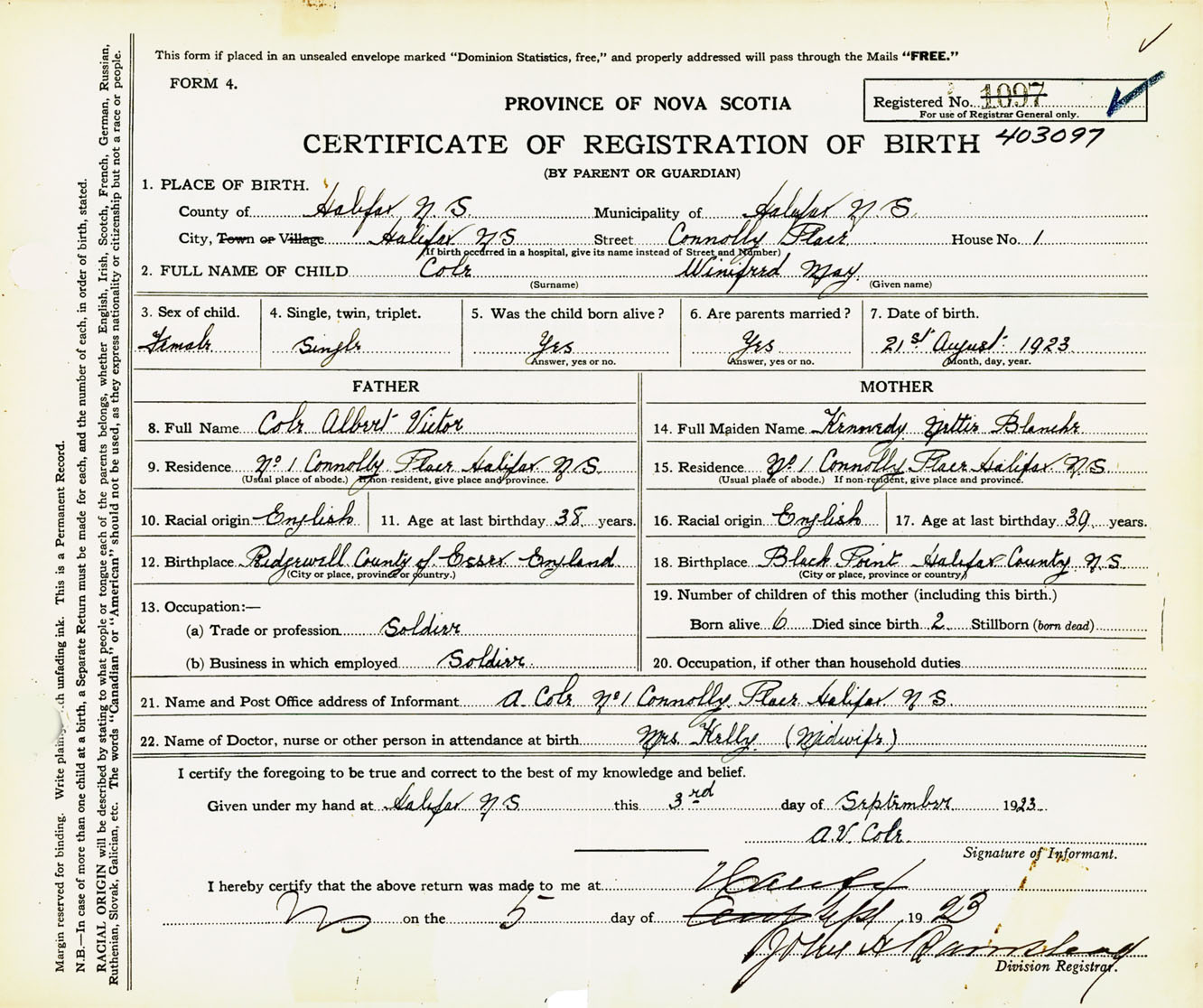 Female Birth Registration: Year: 1923 number: 40300097