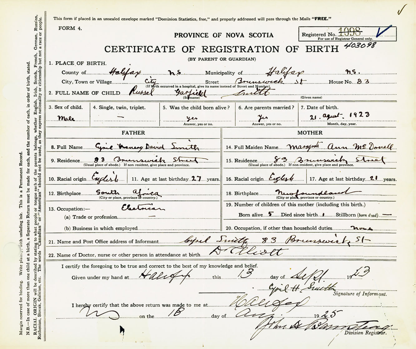 Male Birth Registration: Year: 1923 number: 40300098