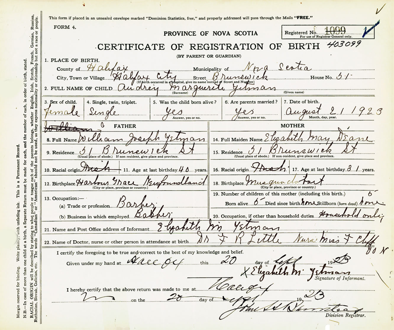 Female Birth Registration: Year: 1923 number: 40300099