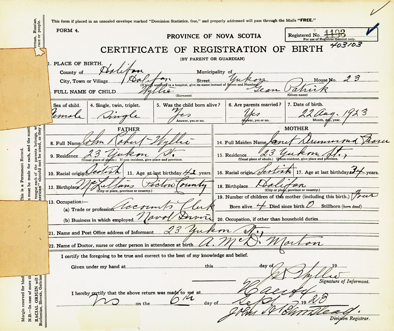 Female Birth Registration: Year: 1923 number: 40300103