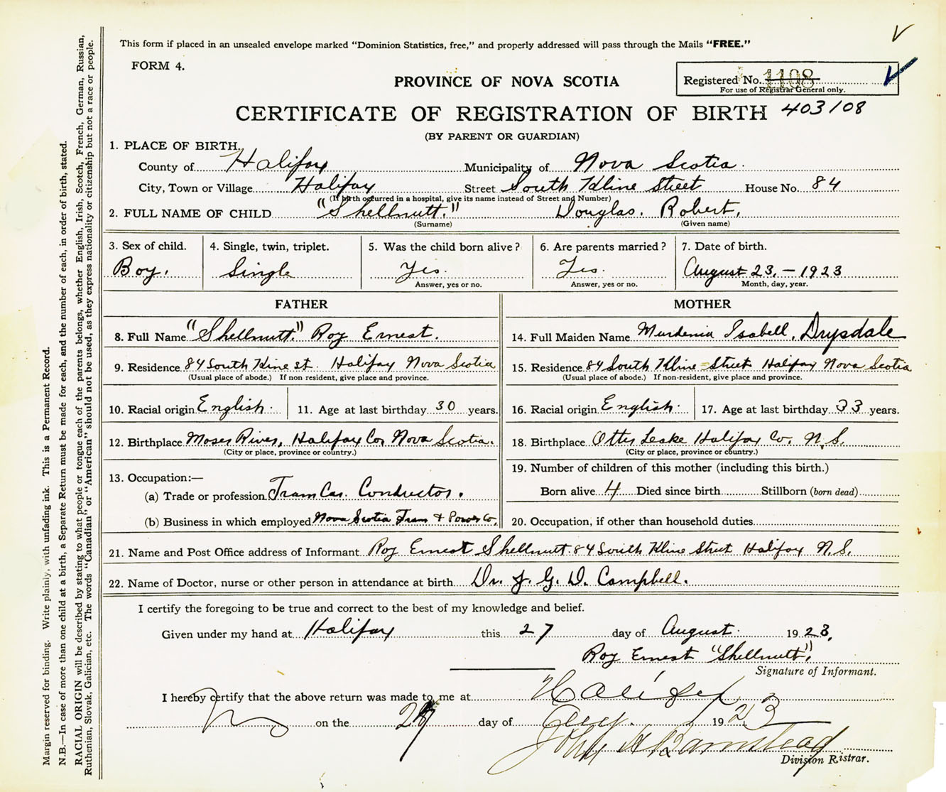 Male Birth Registration: Year: 1923 number: 40300108