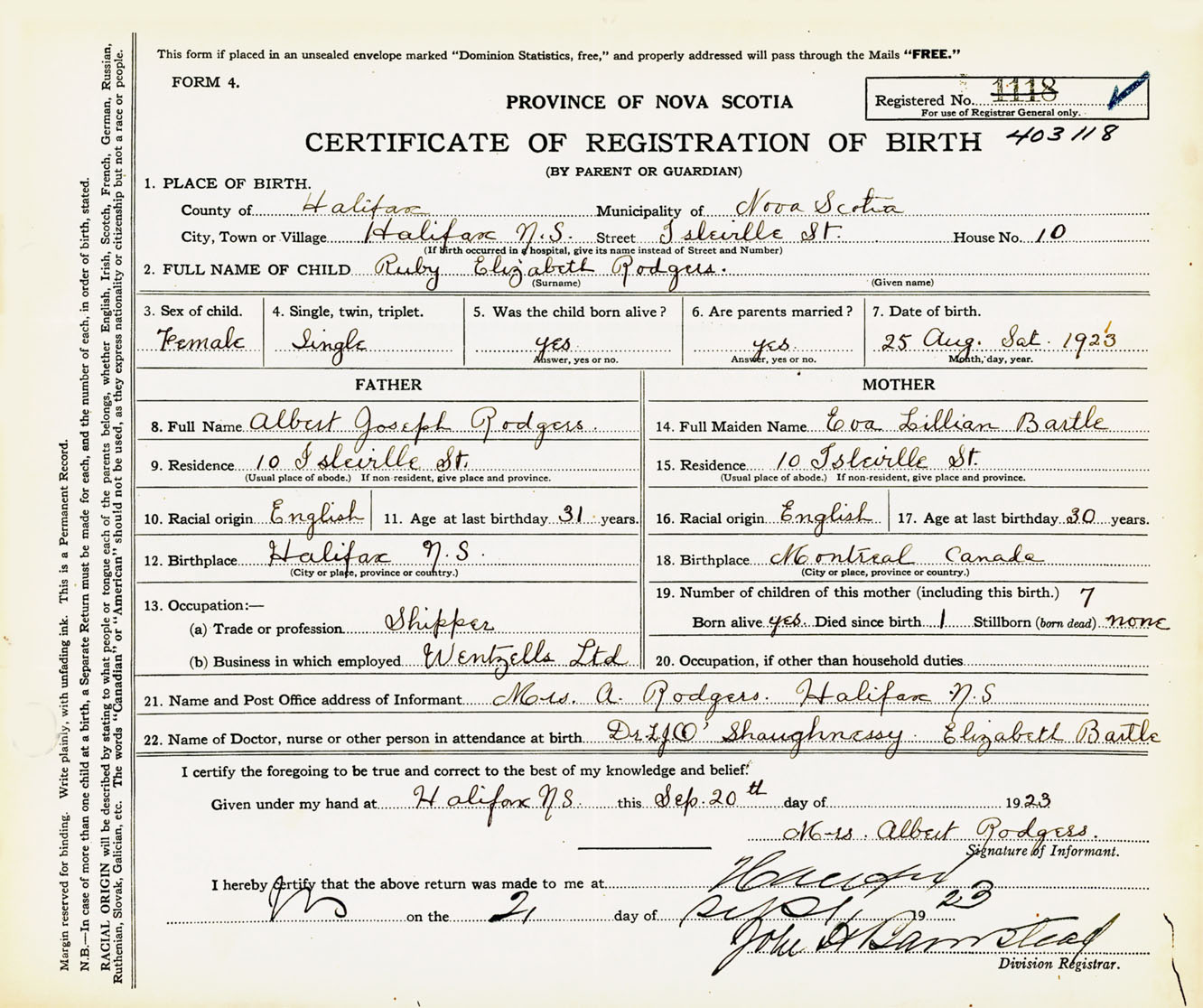 Female Birth Registration: Year: 1923 number: 40300118