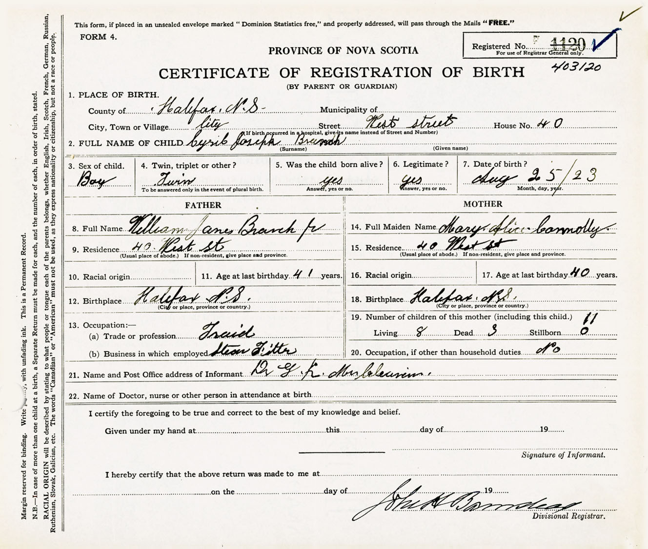 Male Birth Registration: Year: 1923 number: 40300120