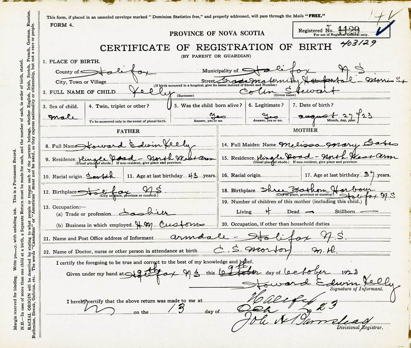 Male Birth Registration: Year: 1923 number: 40300129