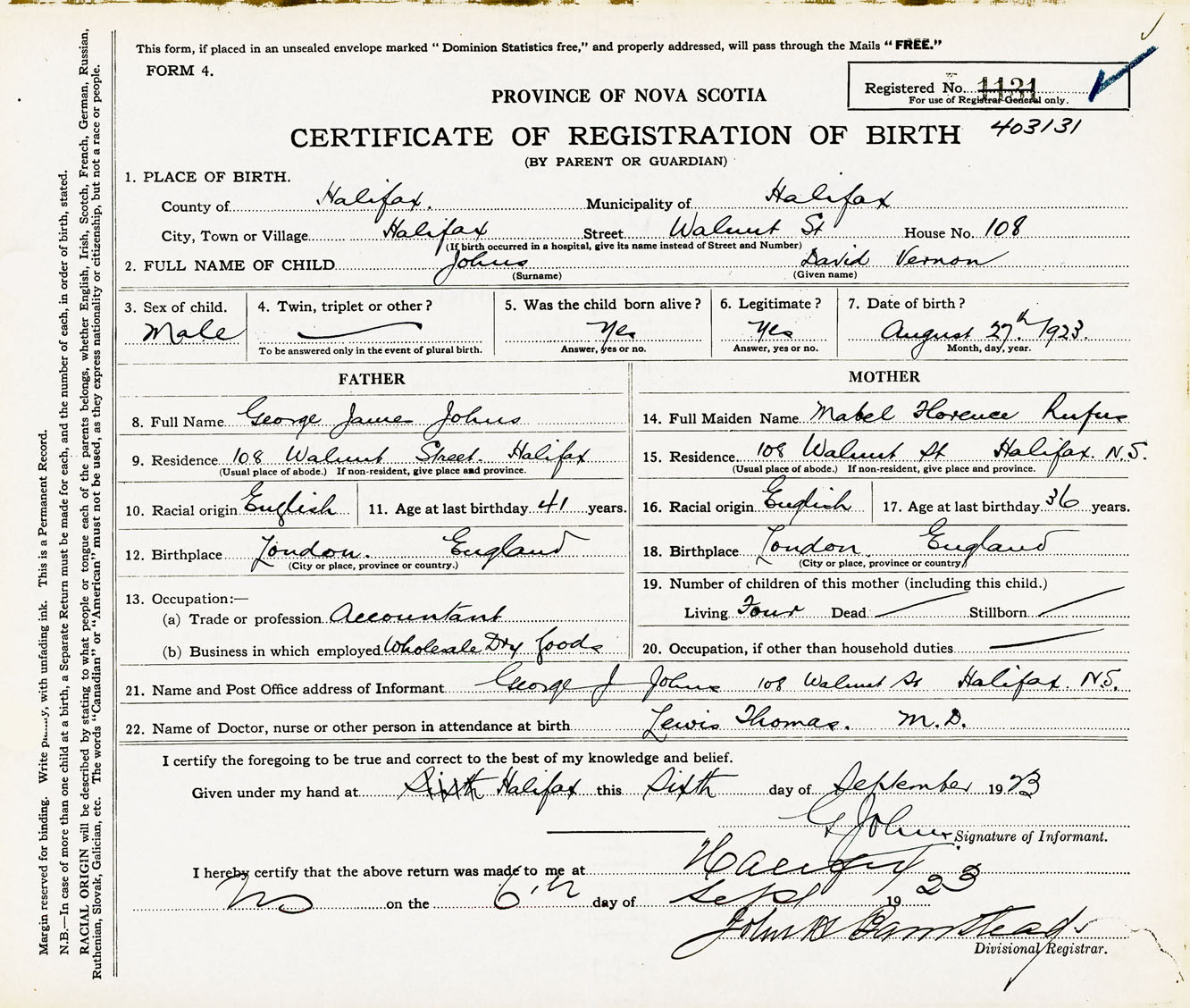 Male Birth Registration: Year: 1923 number: 40300131