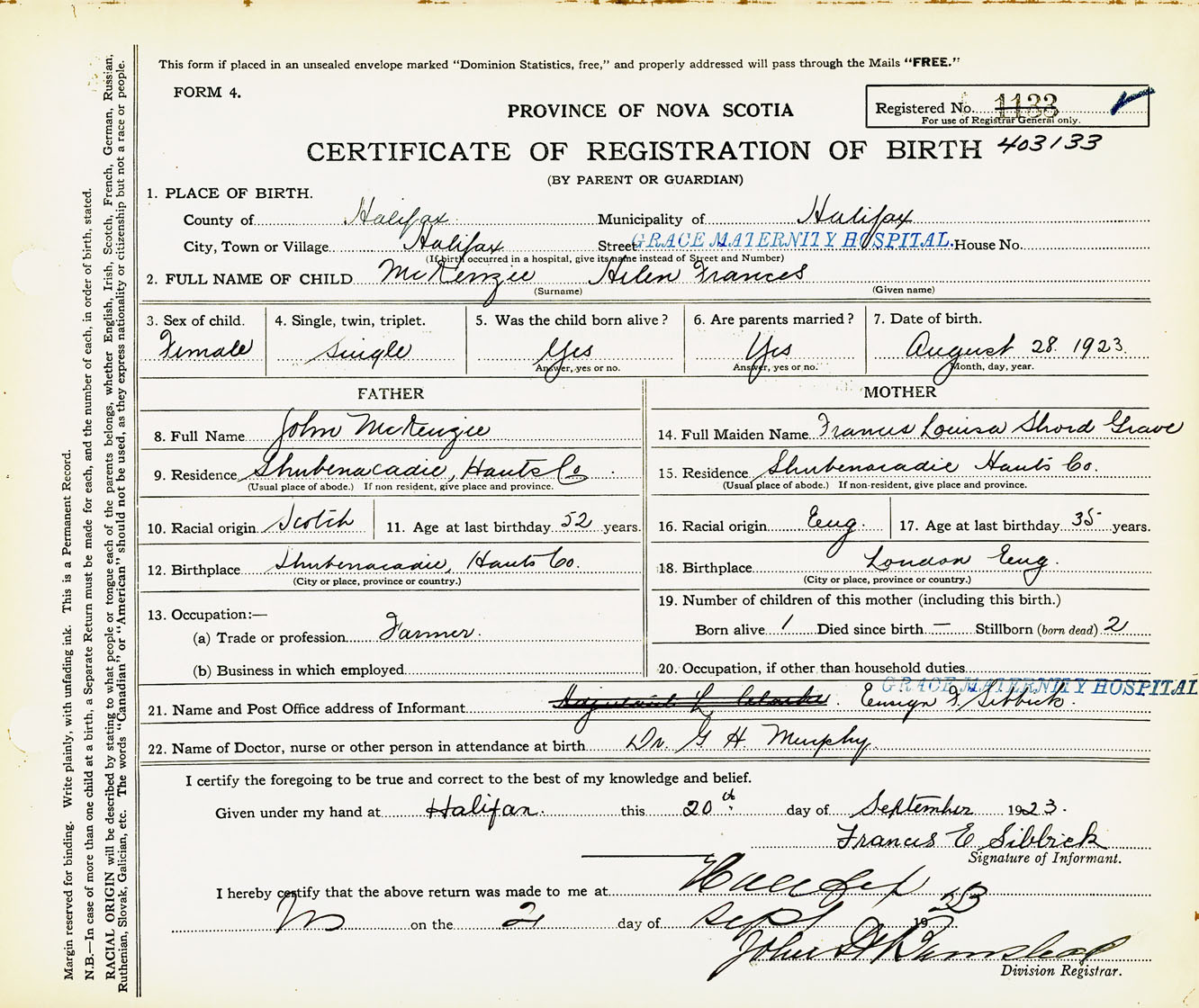 Female Birth Registration: Year: 1923 number: 40300133