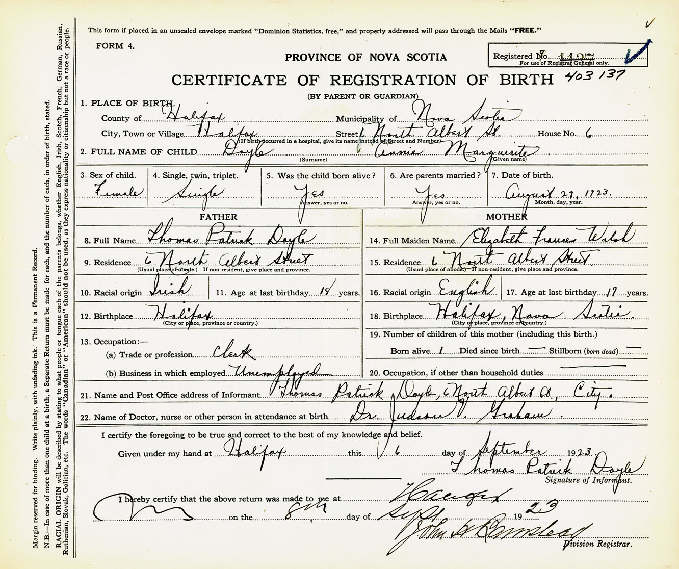 Female Birth Registration: Year: 1923 number: 40300137