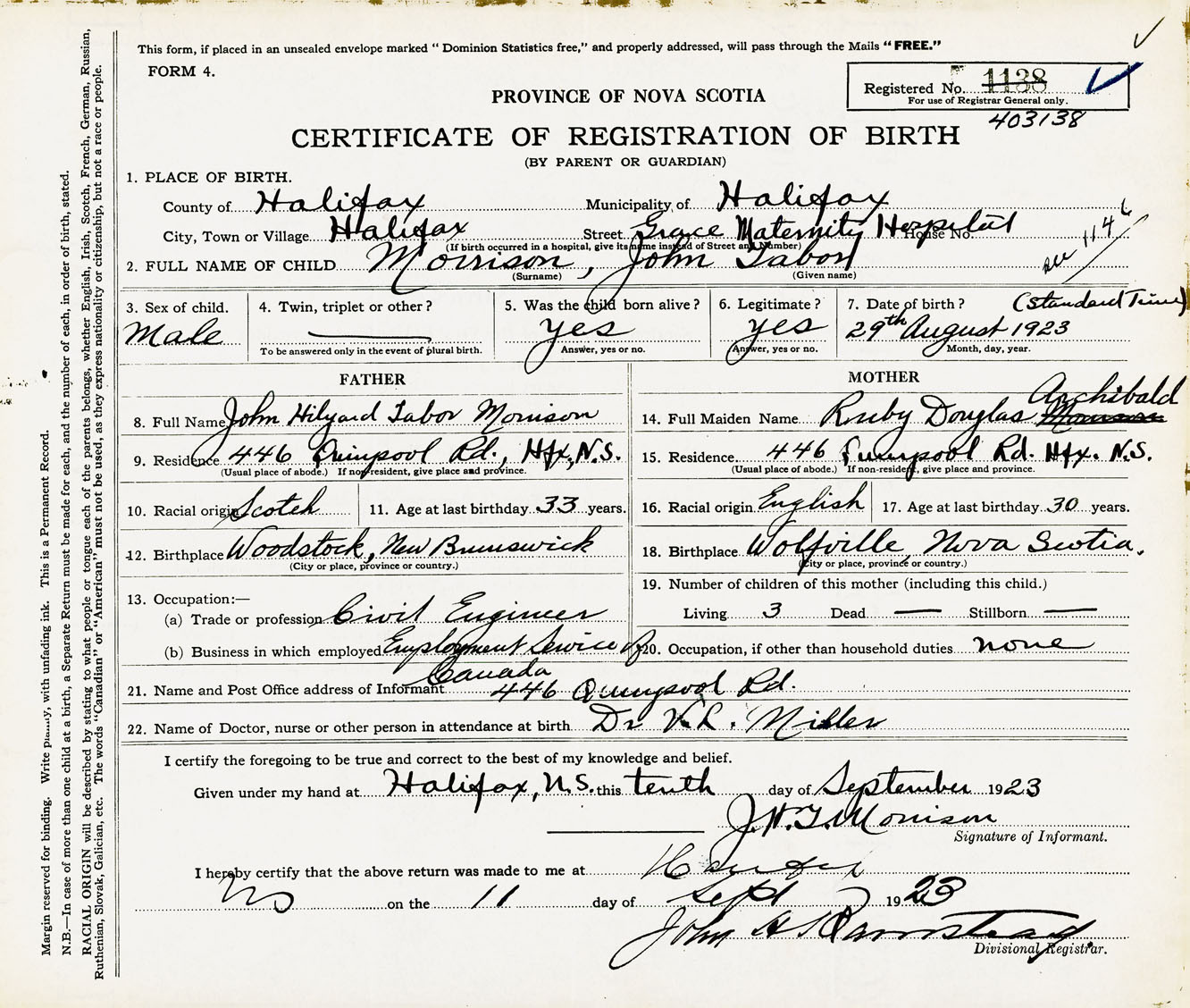 Male Birth Registration: Year: 1923 number: 40300138