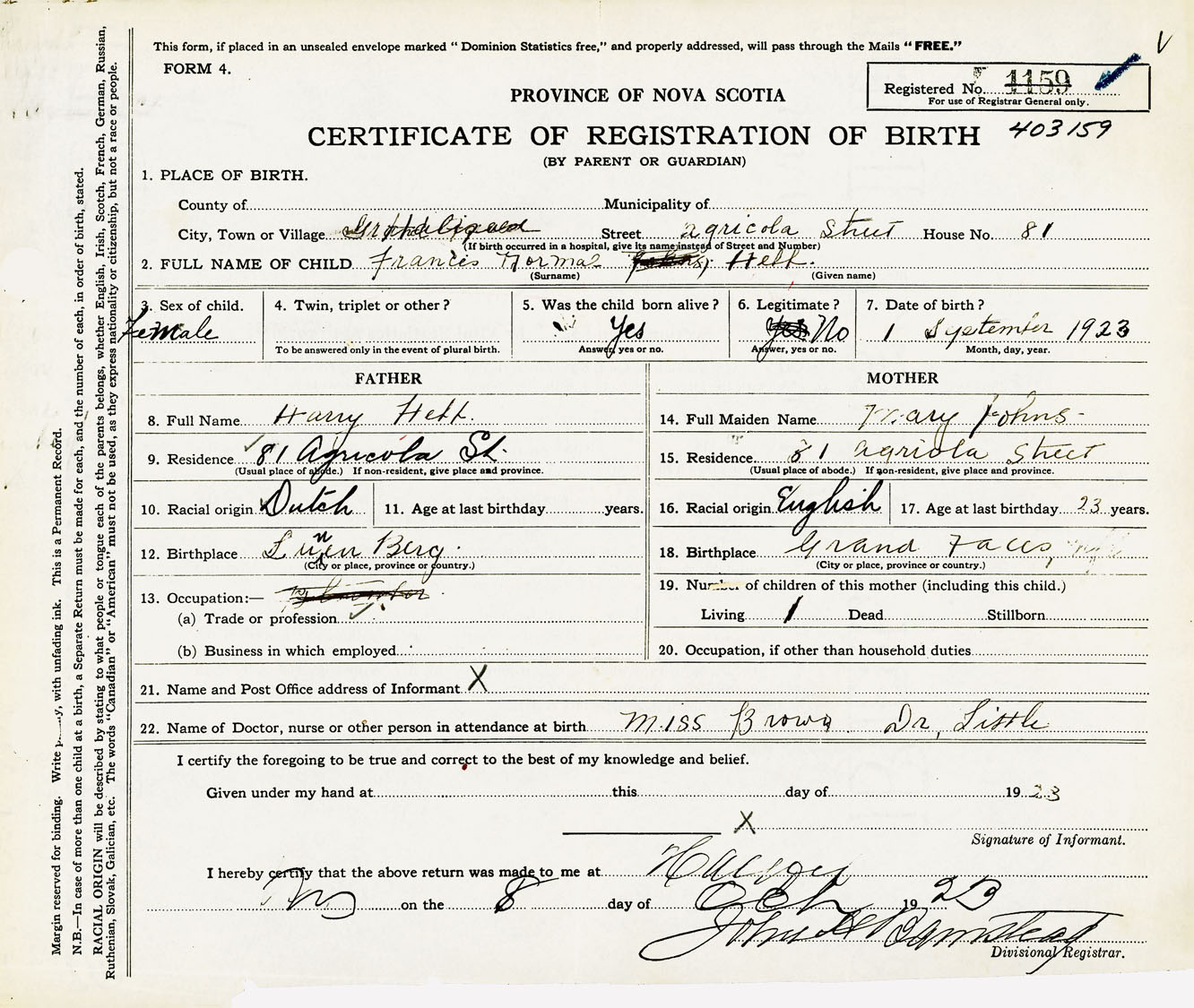 Female Birth Registration: Year: 1923 number: 40300159